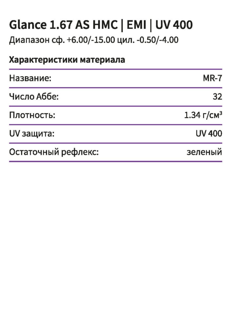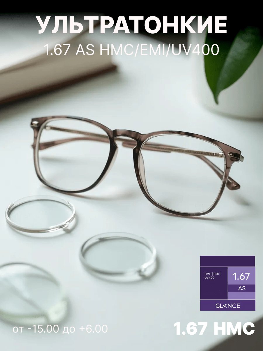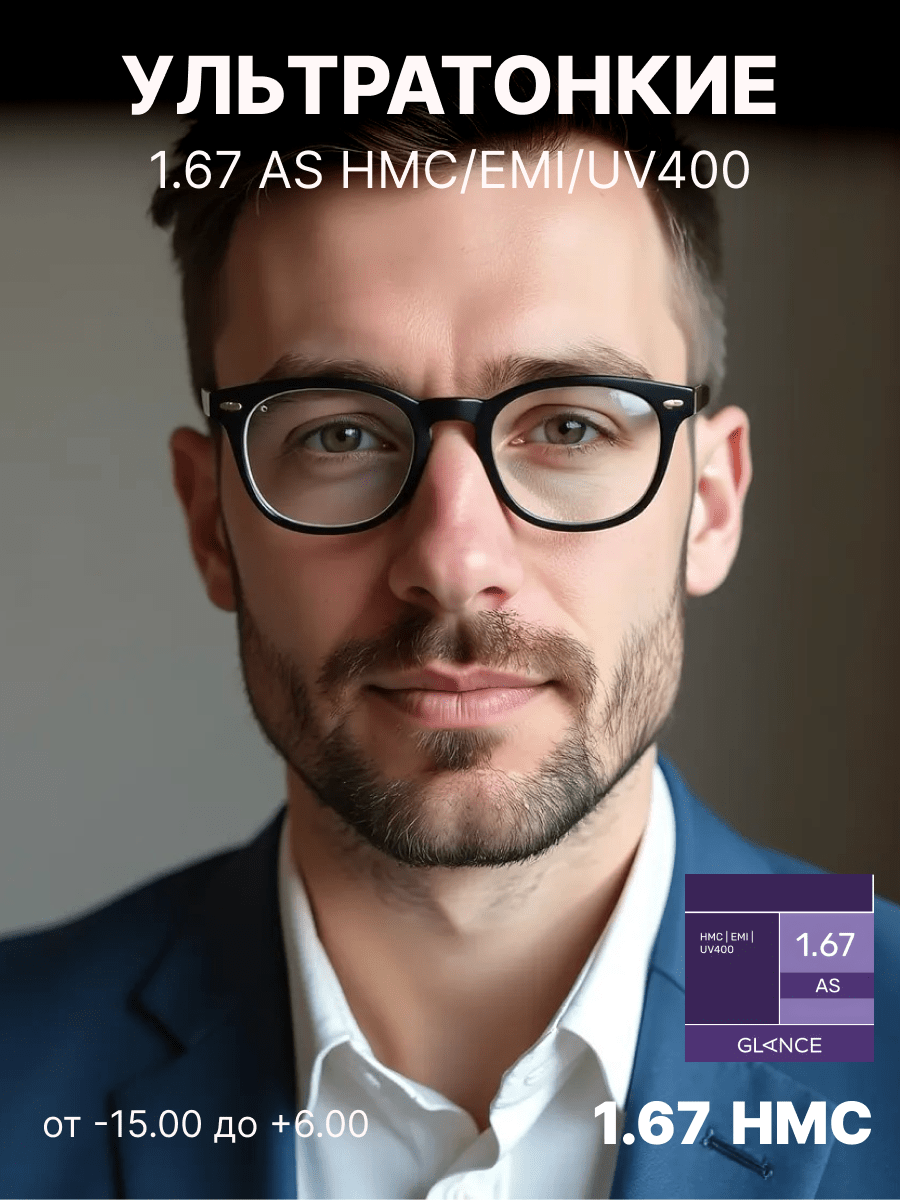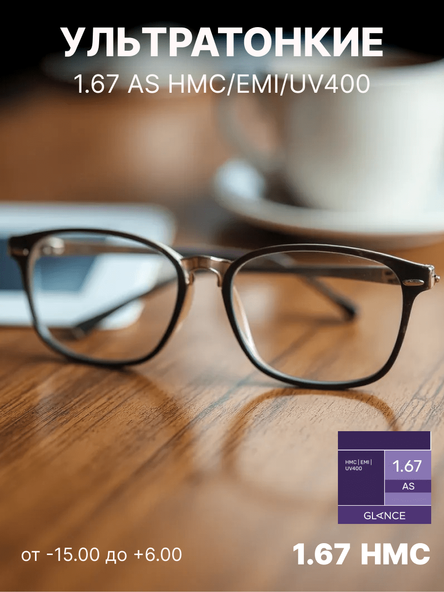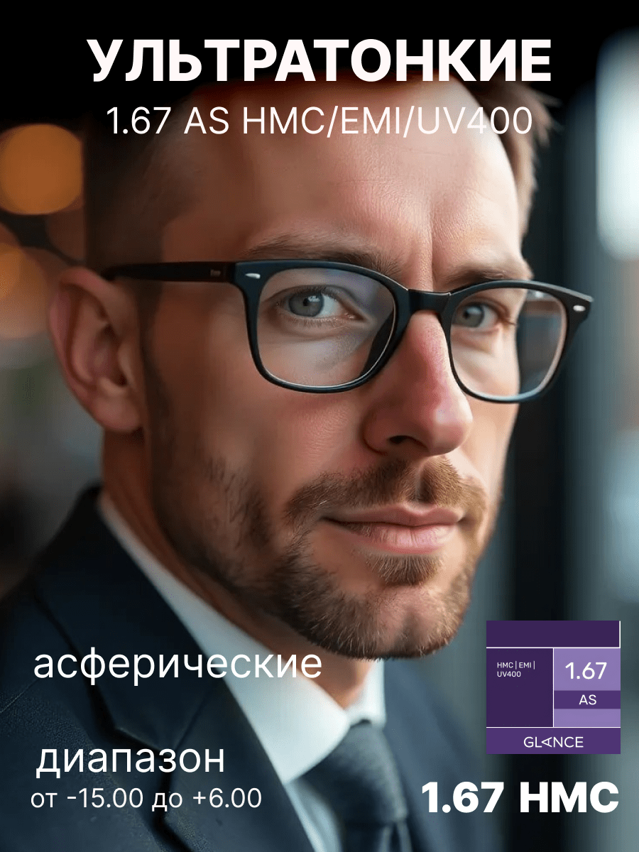 Очень тонкая линза Glance 1,67 AS HMC EMI UV 400 изготовлена из материала с очень высоким коэффициентом преломления ne = 1,67. Эта линза имеет асферический (AS) дизайн и вследствие этого минимальные краевые искажения. Таким образом, достигается качественная передача изображения по всему полю зрения вплоть до края линзы. Близко расположенная к глазу плоская внутренняя поверхность линзы обеспечивает более естественную передачу размера глаза за линзой и изображения окружающих предметов для пользователя. EMI-покрытие — специальное двустороннее металлизированное покрытие, блокирующее электромагнитные волны. Это покрытие обеспечивает защиту от вредного излучения компьютера, телевизора и другой электронной аппаратуры. UV-400 — Специальное покрытие полностью поглощает ультрафиолет в диапазонах UV-B и UV-A вплоть до 400 нм, что обеспечивает максимальную защиту от ультрафиолета.