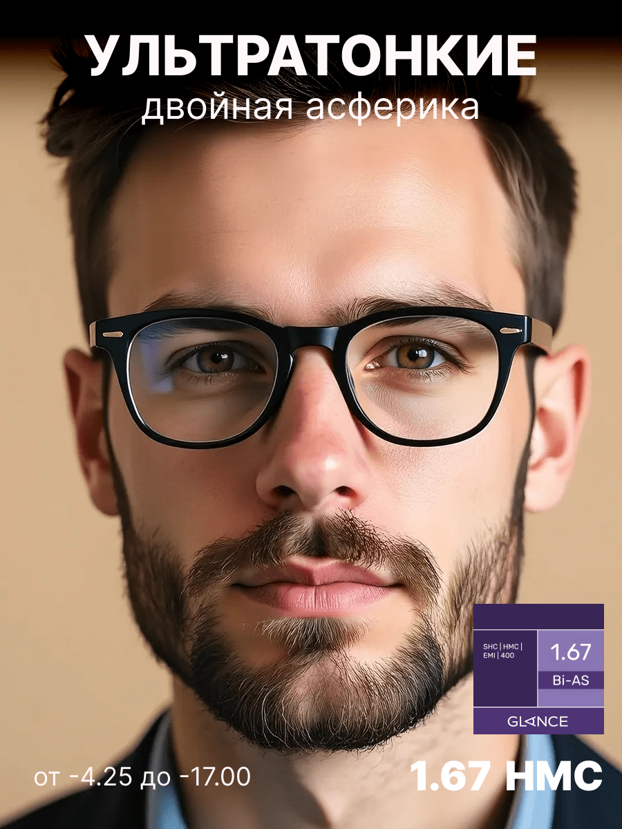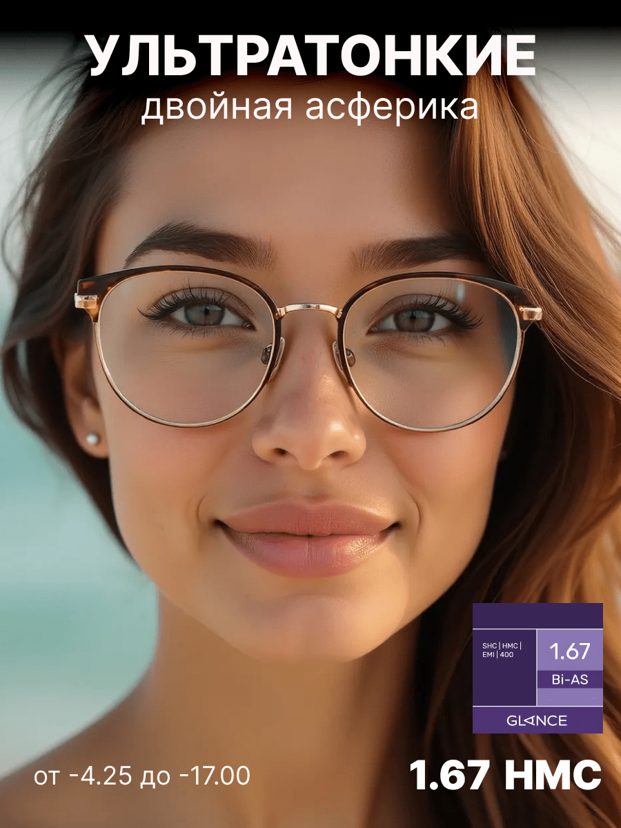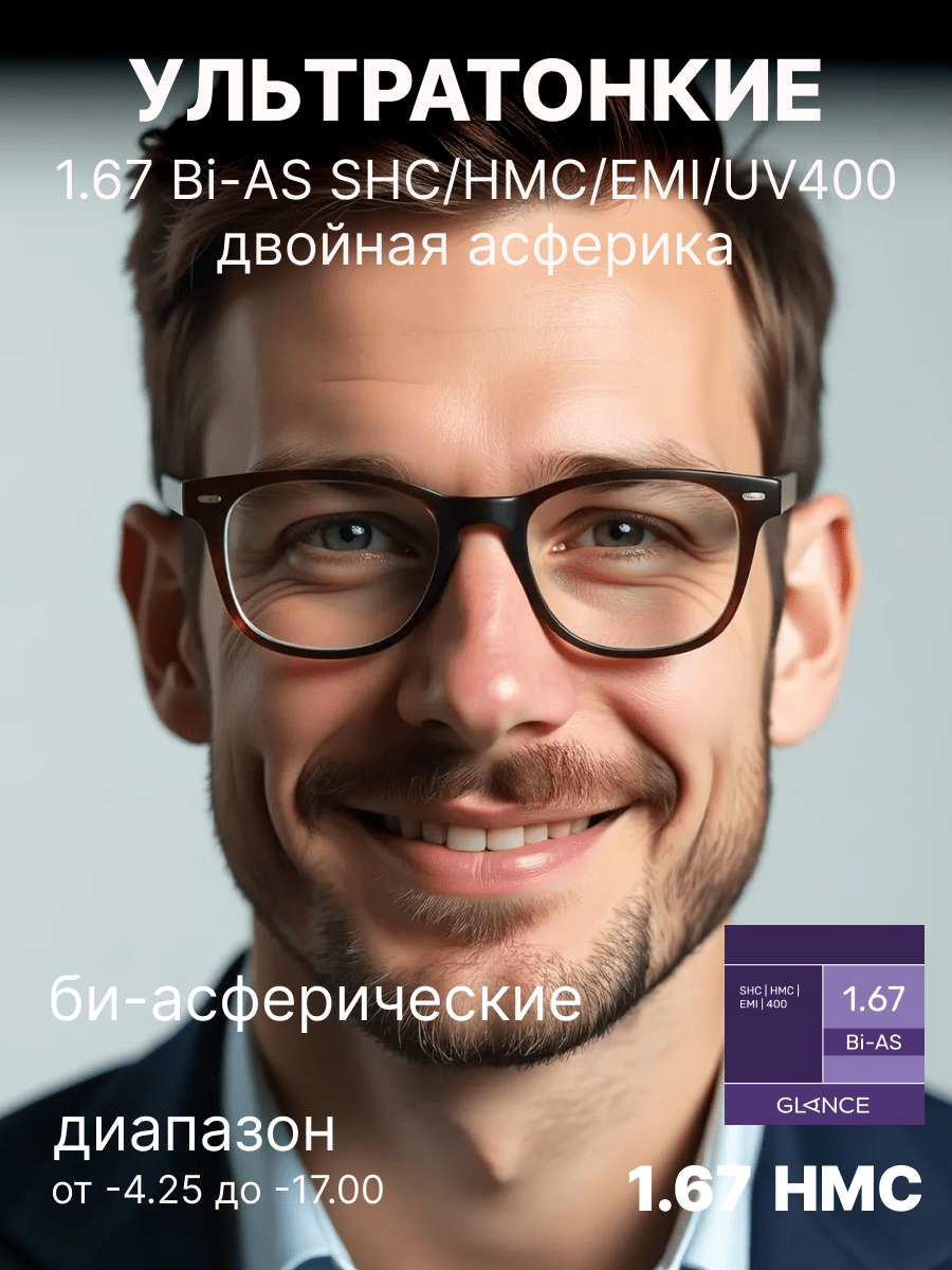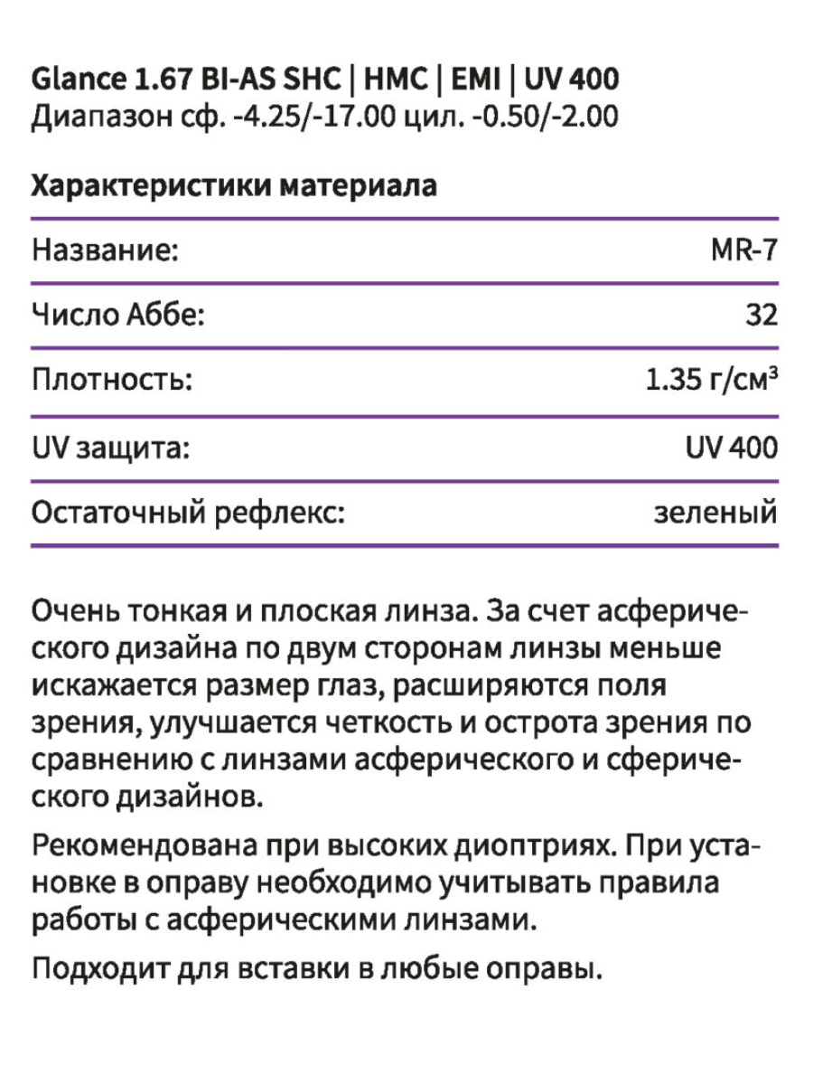 Очень тонкая линза Glance 1.67 Bi-AS Super Hydrophobic Coated HMC/EMI/UV 400 изготовлена из материла с очень высоким коэффициентом преломления ne=1,67. Линза имеет асферический дизайн на обеих поверхностях, а не только на передней. Эта, так называемая, Би-асферическая (Bi-As) линза характеризуется минимальными краевыми искажениями. Таким образом, достигается качественная передача изображения по всему полю зрения вплоть до края линзы. Близко расположенная к глазу плоская внутренняя поверхность линзы обеспечивает более естественную передачу размера глаза за линзой и изображения предметов для пользователя. Дополнительное покрытие Super Hydrophobic Coated обеспечивает особо высокие водоотталкивающие свойства поверхности линзы. EMI- покрытие – специальное двустороннее металлизированное покрытие, блокирующее электромагнитные волны. Это покрытие обеспечивает защиту от вредного излучения компьютера, телевизора и другой электронной аппаратуры. UV-400 – специальное покрытие полностью поглощает ультрафиолет и диапа-зонах UV-B и UV-A вплоть до 400 нм, что обеспечивает максимальную защиту от ультрафиолета.