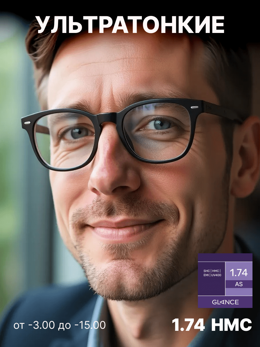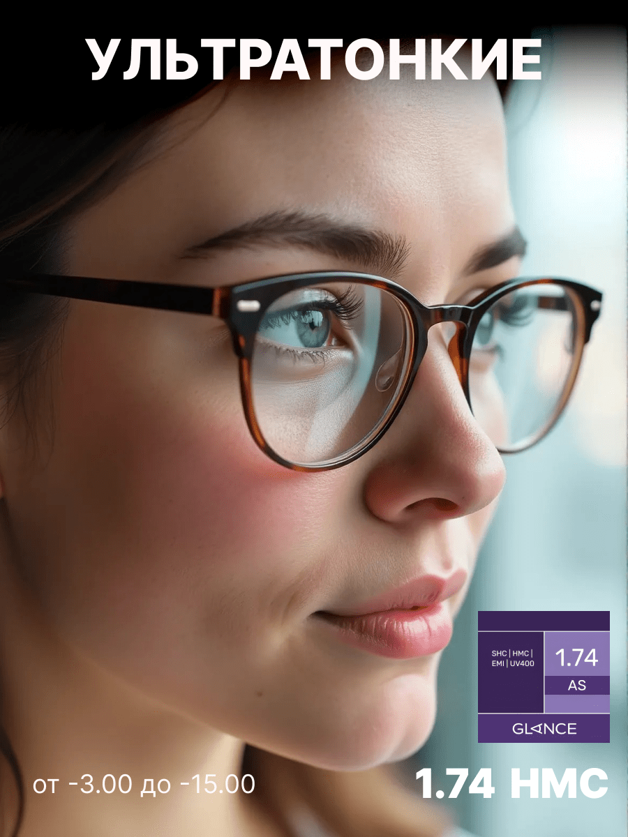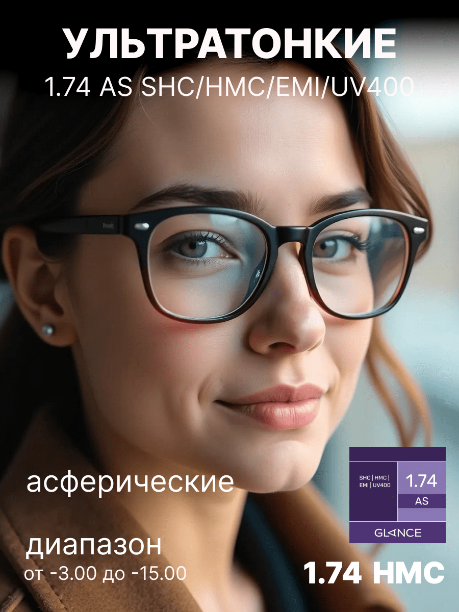 Полимерные асферические линзы с коэффициентом преломления 1.74 являются высокотехнологичным решением для людей с высоким уровнем рефракции (сильной близорукостью или дальнозоркостью). Благодаря своему сверхутонченному дизайну такие линзы максимально лёгкие и тонкие, что обеспечивает эстетичный вид даже при высоких диоптриях по сравнению с традиционными линзами. Асферическая конструкция линзы позволяет эффективно минимизировать искажения по краям, обеспечивая более чёткое и естественное зрение, особенно в периферийных зонах.