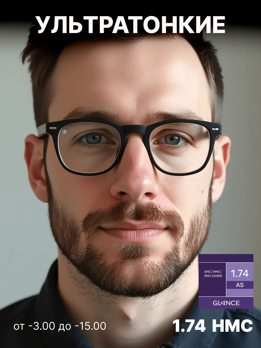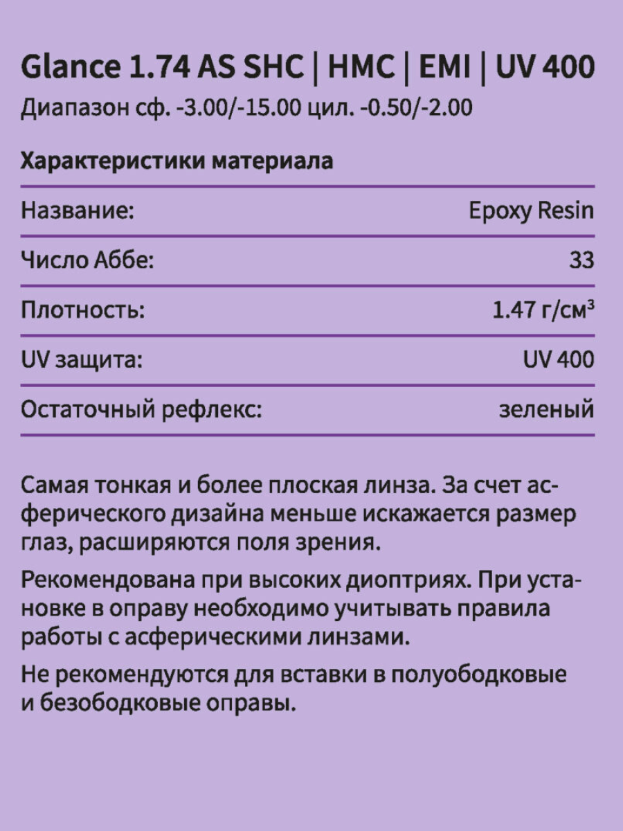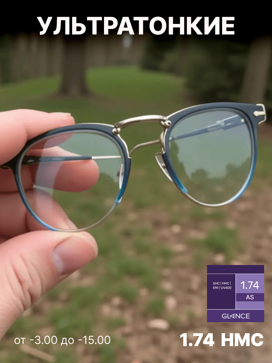 Полимерные асферические линзы с коэффициентом преломления 1.74 являются высокотехнологичным решением для людей с высоким уровнем рефракции (сильной близорукостью или дальнозоркостью). Благодаря своему сверхутонченному дизайну такие линзы максимально лёгкие и тонкие, что обеспечивает эстетичный вид даже при высоких диоптриях по сравнению с традиционными линзами. Асферическая конструкция линзы позволяет эффективно минимизировать искажения по краям, обеспечивая более чёткое и естественное зрение, особенно в периферийных зонах.