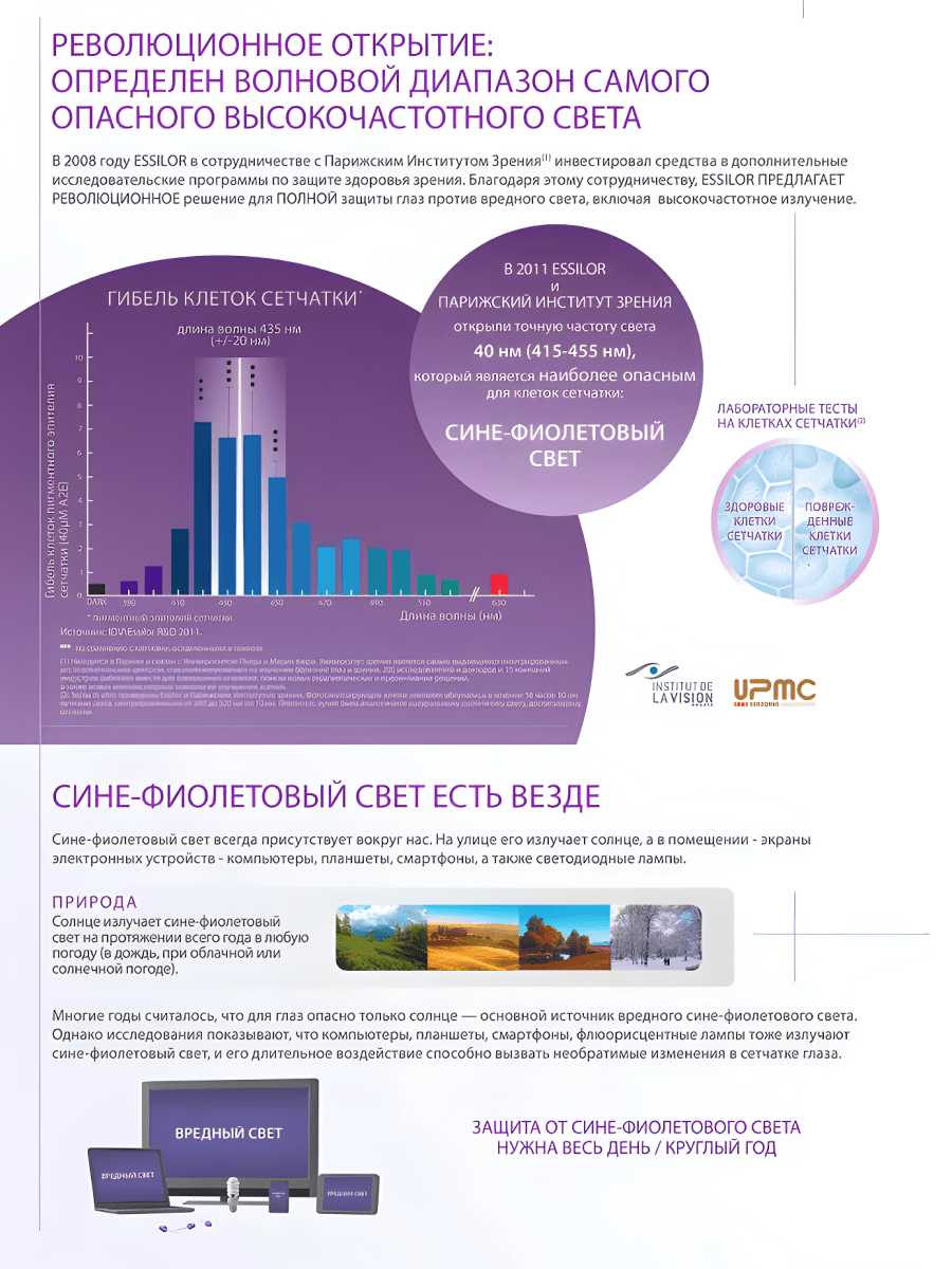 Весь диапазон видимого синего света можно разделить на сине-фиолетовый и сине-голубой. Каждый из них оказывает свое особое влияние на наш организм. Излучение сине-фиолетового спектра света связывают с риском развития заболеваний сетчатки (ВМД). Кроме того, синий свет, излучаемый экранами электронных гаджетов, вызывает зрительное напряжение. Сине-голубой диапазон, напротив, полезен для человека, он участвует в процессах контроля сна и бодрствования, влияет на наши эмоции, память, способность к обучению.