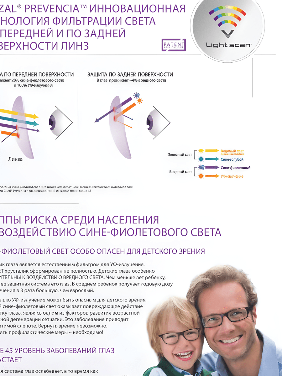 Технология Light Scan, реализованная в покрытии Crizal Prevencia, избирательно фильтрует опасный сине-фиолетовый свет, позволяя полезному сине-голубому свету беспрепятственно проходить через линзу. При этом длительная работа за компьютером не вызывает усталости, и надолго сохраняется здоровье глаз.