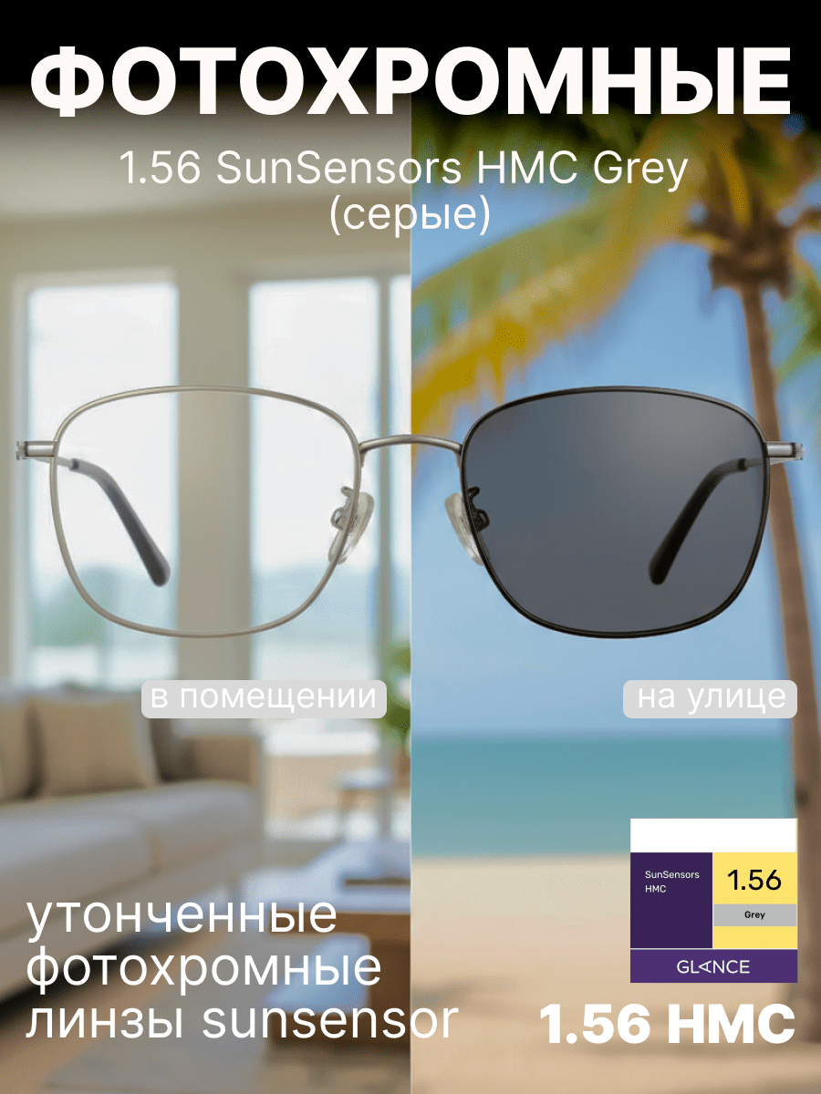 Линза Glance SunSensors Grаy 1.56 HMC изготовлена из полимерного фотохромного материала SunSensors серого цвета со средним показателем преломления ne=1.56 с учетом объемно-распределенной фотохромной технологии компании Corning. Такая технология позволяет линзе быстро реагировать на любые изменения освещения и обеспечивать однородную цветность во всех рефракциях, а также продлевает ее срок службы. Благодаря низкой плотности = 1,11 г/см3 – линза обладает комфортной легкостью и эстетичной тонкостью. Светопропускание в видимом диапазоне (380-780нм) в прозрачном состоянии – 85%, после 15мин затемнения - 20%, при осветлении в помещении через 5мин – 63%. При t=120 и ниже степень затемнения может быть слишком темной для вождения открытых транспортных средств и при переходе из солнечной зоны в тень.