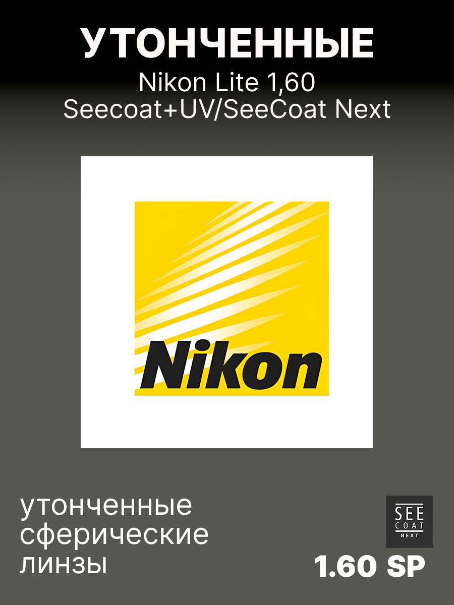 Утонченные однофокальные линзы Nikon Lite 1,60 с многофункциональным покрытием Seecoat Plus UV до 30% тоньше и легче, чем обычные линзы из материала 1.50. До 25% более плоские, чем линзы стандартного дизайна из материала 1.50. Покрытие SeeСoat Plus UV гарантирует бескомпромиссный зрительный комфорт, простоту ухода и долгий срок службы линзы. Обеспечивает 100% защиту от УФ излучения (400 нм.).
