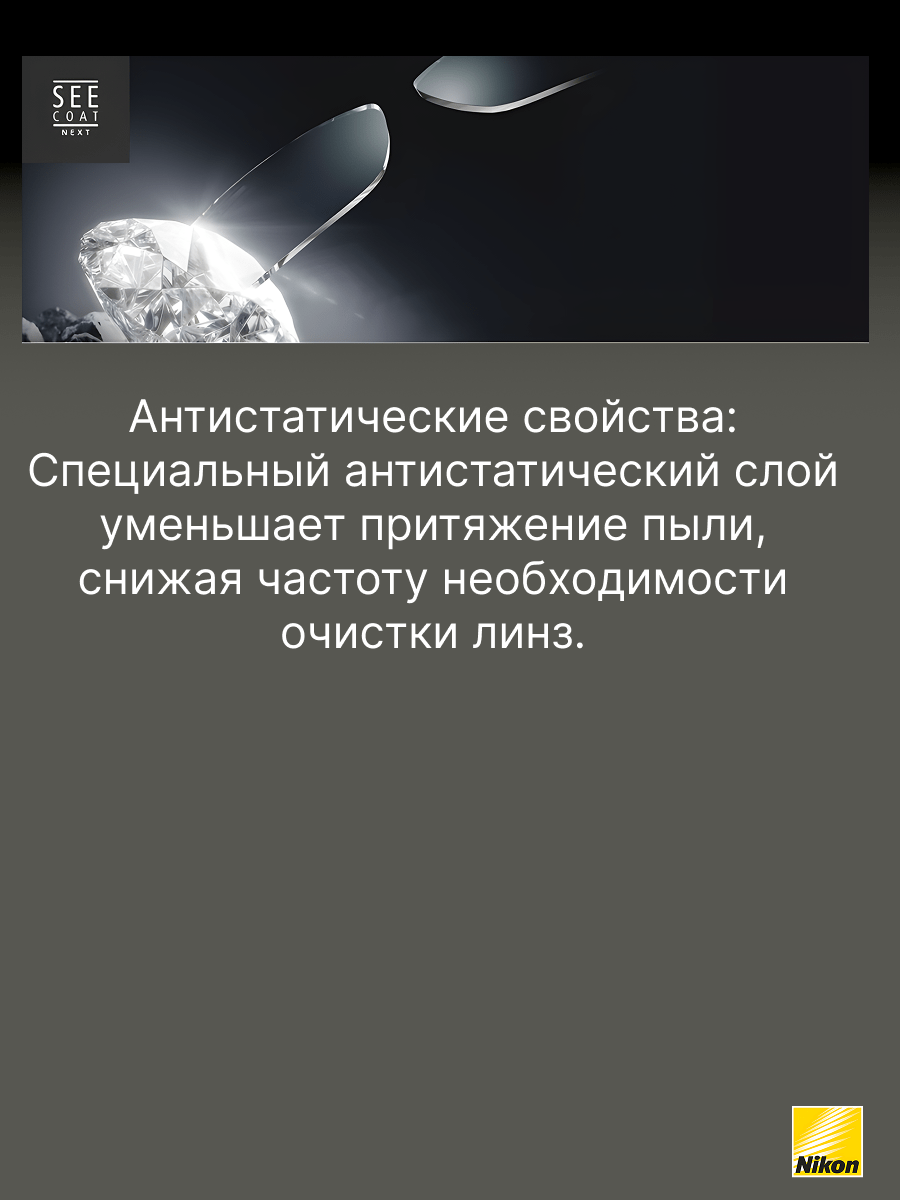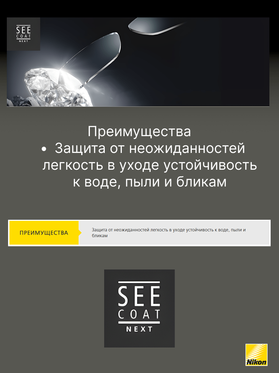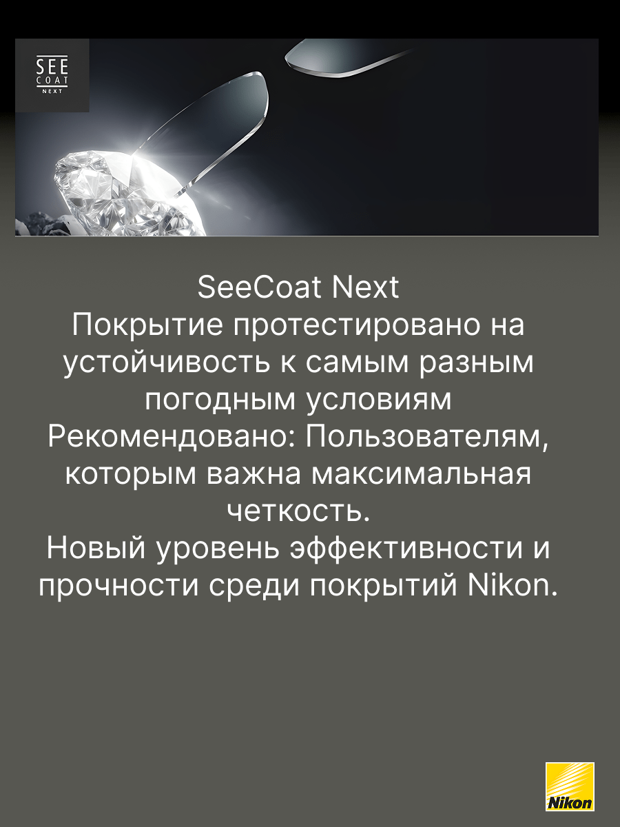 SeeCoat Next — это инновационное многофункциональное покрытие для очковых линз от компании Nikon. Оно обеспечивает максимально высокий уровень прозрачности и комфорта в любых условиях. Благодаря передовым технологиям, покрытие эффективно защищает линзы от царапин, отпечатков пальцев, пыли и пятен, облегчая уход за очками в течение всего срока службы. Устойчивость к царапинам — особый прочный слой надёжно защищает линзы от механических повреждений. Антистатический эффект — снижает накопление пыли и иных загрязнений на поверхности линзы. Защита от пятен и отпечатков — гидрофобное и олеофобное покрытие предотвращает появление следов от пальцев и облегчает очистку. Высокая прозрачность — минимальное отражение и максимальная чёткость зрения даже при ярком свете. Долговечность — покрытие сохраняет свои свойства даже при длительном и интенсивном использовании. SeeCoat Next от Nikon — это выбор для тех, кто ценит идеальную чистоту, высокой качество зрения и долговечность линз своих очков.