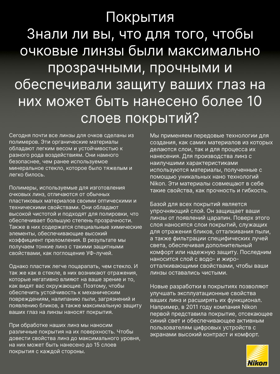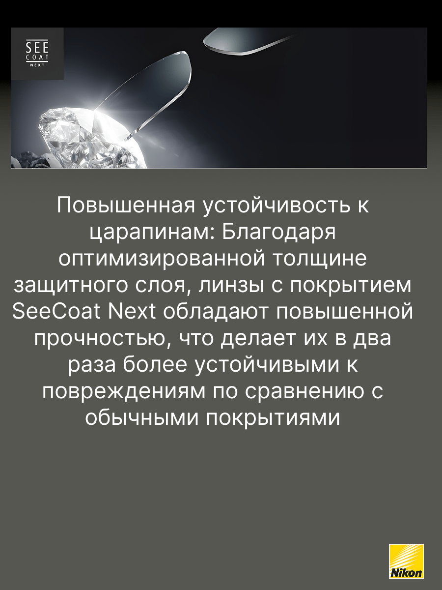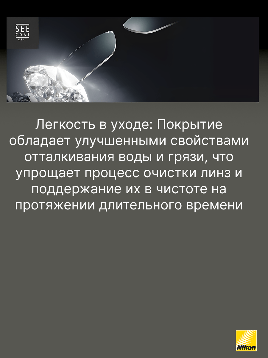 SeeCoat Next — это инновационное многофункциональное покрытие для очковых линз от компании Nikon. Оно обеспечивает максимально высокий уровень прозрачности и комфорта в любых условиях. Благодаря передовым технологиям, покрытие эффективно защищает линзы от царапин, отпечатков пальцев, пыли и пятен, облегчая уход за очками в течение всего срока службы. Устойчивость к царапинам — особый прочный слой надёжно защищает линзы от механических повреждений. Антистатический эффект — снижает накопление пыли и иных загрязнений на поверхности линзы. Защита от пятен и отпечатков — гидрофобное и олеофобное покрытие предотвращает появление следов от пальцев и облегчает очистку. Высокая прозрачность — минимальное отражение и максимальная чёткость зрения даже при ярком свете. Долговечность — покрытие сохраняет свои свойства даже при длительном и интенсивном использовании. SeeCoat Next от Nikon — это выбор для тех, кто ценит идеальную чистоту, высокой качество зрения и долговечность линз своих очков.