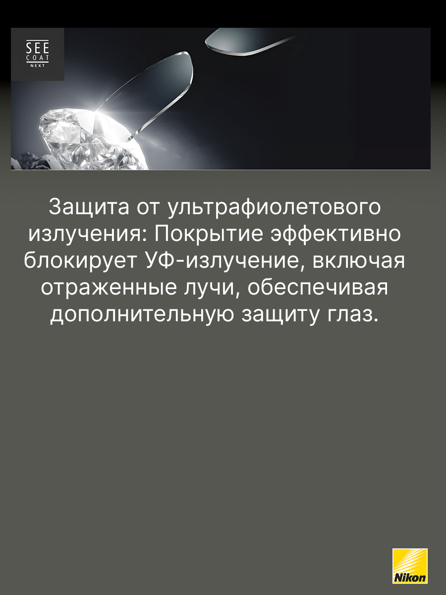 Совершенное многофункциональное покрытие SeeCoat Plus UV от компании Nikon. При создании покрытия Seecoat+ UV были использованы самые передовые технологии производства, что позволило произвести реконструкцию и оптимизацию слоев покрытия. В конечном результате пользователю линз гарантируется высокий уровень качества и комфорта, а также превосходные оптические характеристики покрытия. Основные преимущства: полная защита от УФ лучей (как от прямых, так и от отраженных) эстетичный внешний вид (технология BROADBAND) отличные антистатические свойства обеспечивают простоту ухода (технология STATIC DIFFUSION) толщина просветляющего покрытия оптимизирована для лучшей устойчивости к появлению царапин (технология POWER GUARD) *состав упрочняющего и базового слоев покрытия усовершенствован для гарантированной защиты от механических повреждений для увеличения устойчивости к механическим повреждениям (технология NANO FLEX)