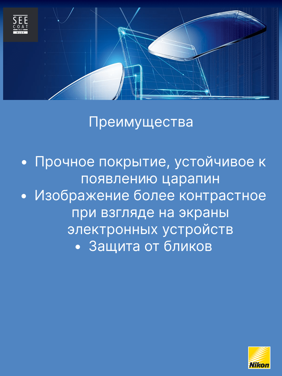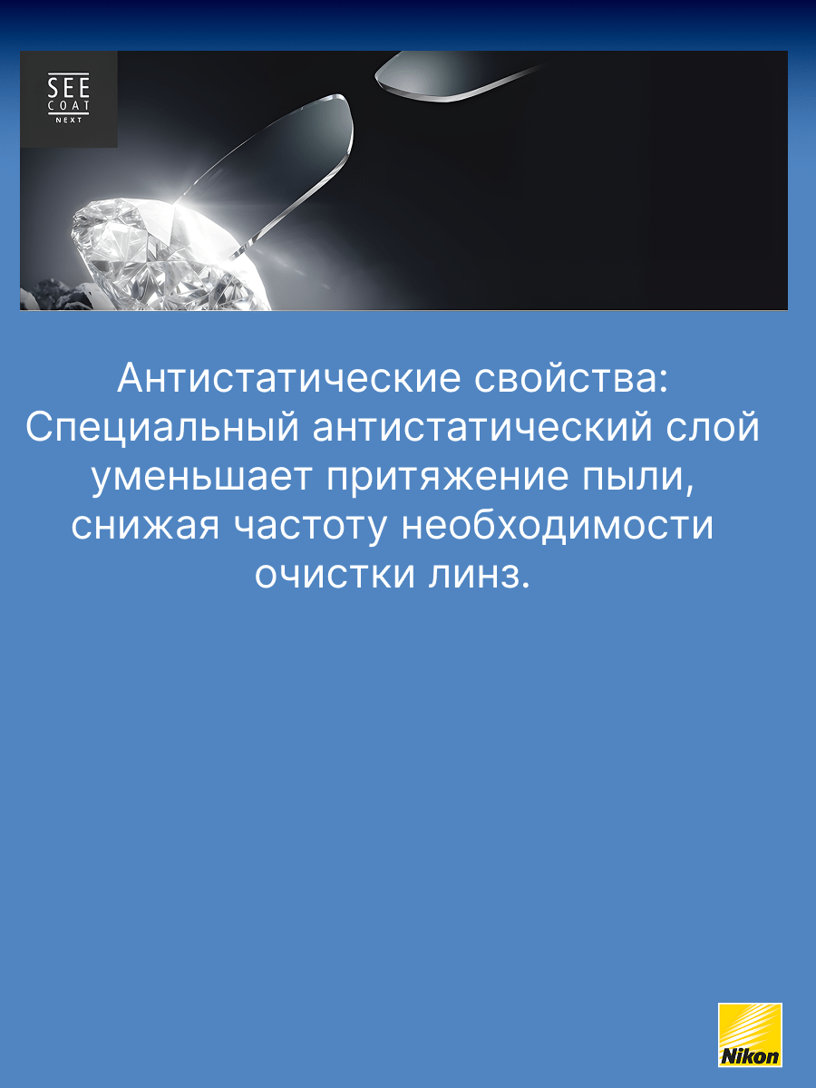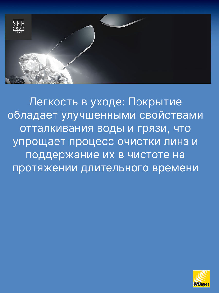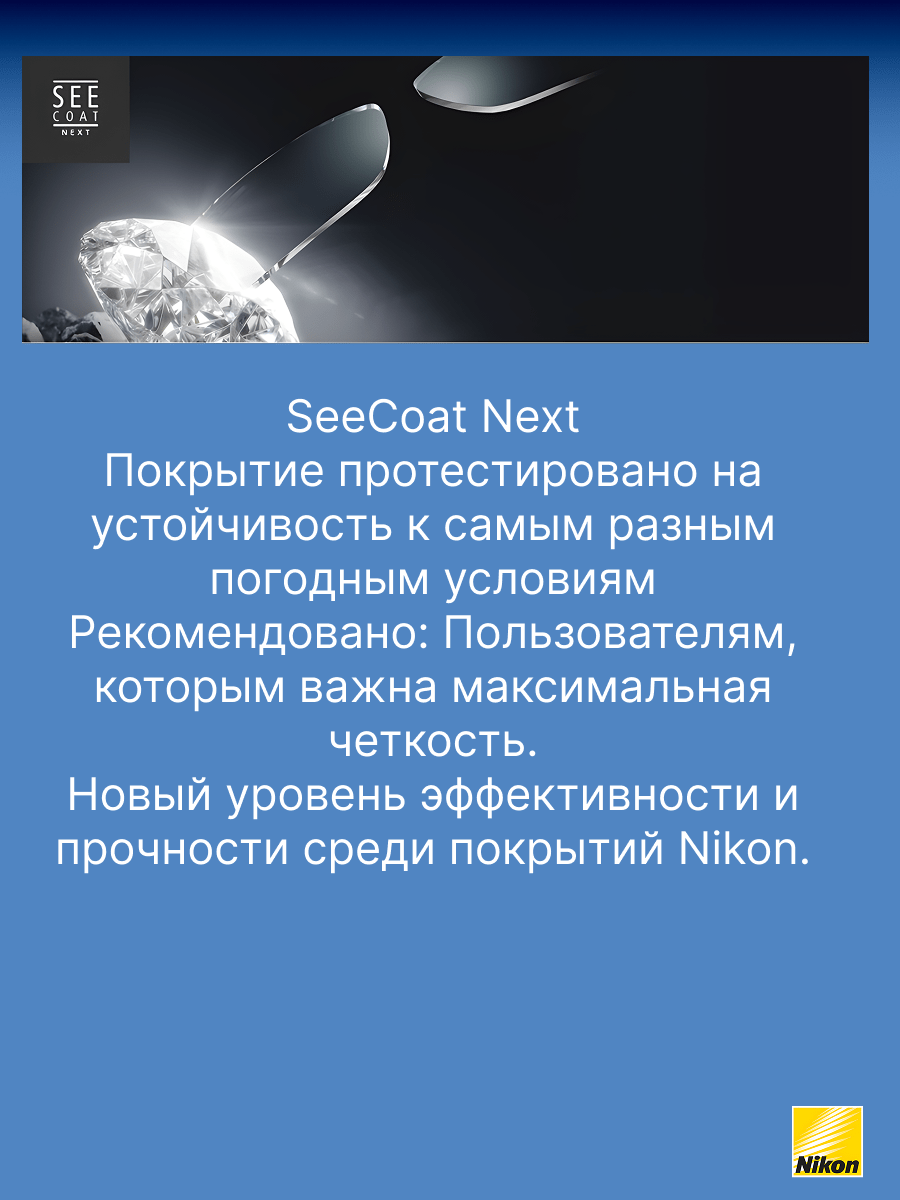 SeeCoat Next — это инновационное многофункциональное покрытие для очковых линз от компании Nikon. Оно обеспечивает максимально высокий уровень прозрачности и комфорта в любых условиях. Благодаря передовым технологиям, покрытие эффективно защищает линзы от царапин, отпечатков пальцев, пыли и пятен, облегчая уход за очками в течение всего срока службы. Устойчивость к царапинам — особый прочный слой надёжно защищает линзы от механических повреждений. Антистатический эффект — снижает накопление пыли и иных загрязнений на поверхности линзы. Защита от пятен и отпечатков — гидрофобное и олеофобное покрытие предотвращает появление следов от пальцев и облегчает очистку. Высокая прозрачность — минимальное отражение и максимальная чёткость зрения даже при ярком свете. Долговечность — покрытие сохраняет свои свойства даже при длительном и интенсивном использовании. SeeCoat Next от Nikon — это выбор для тех, кто ценит идеальную чистоту, высокой качество зрения и долговечность линз своих очков.