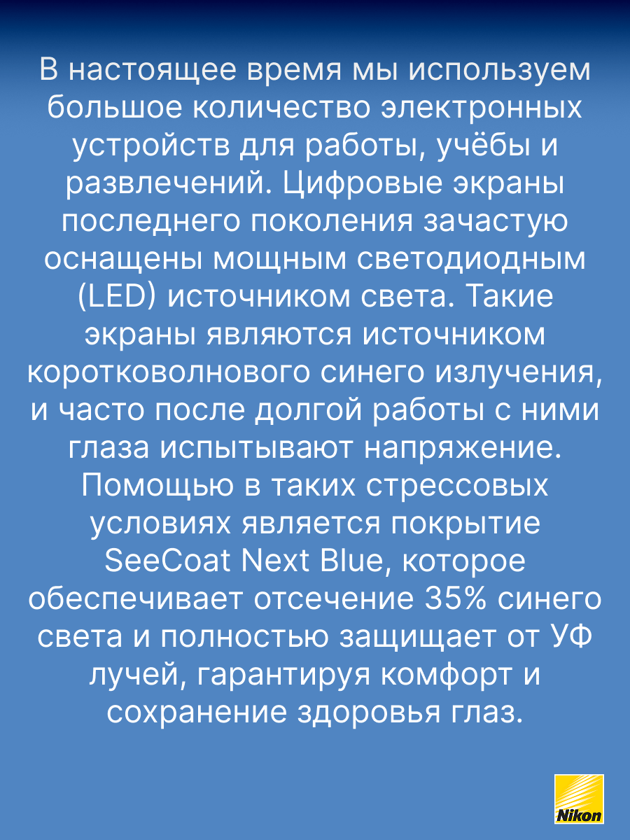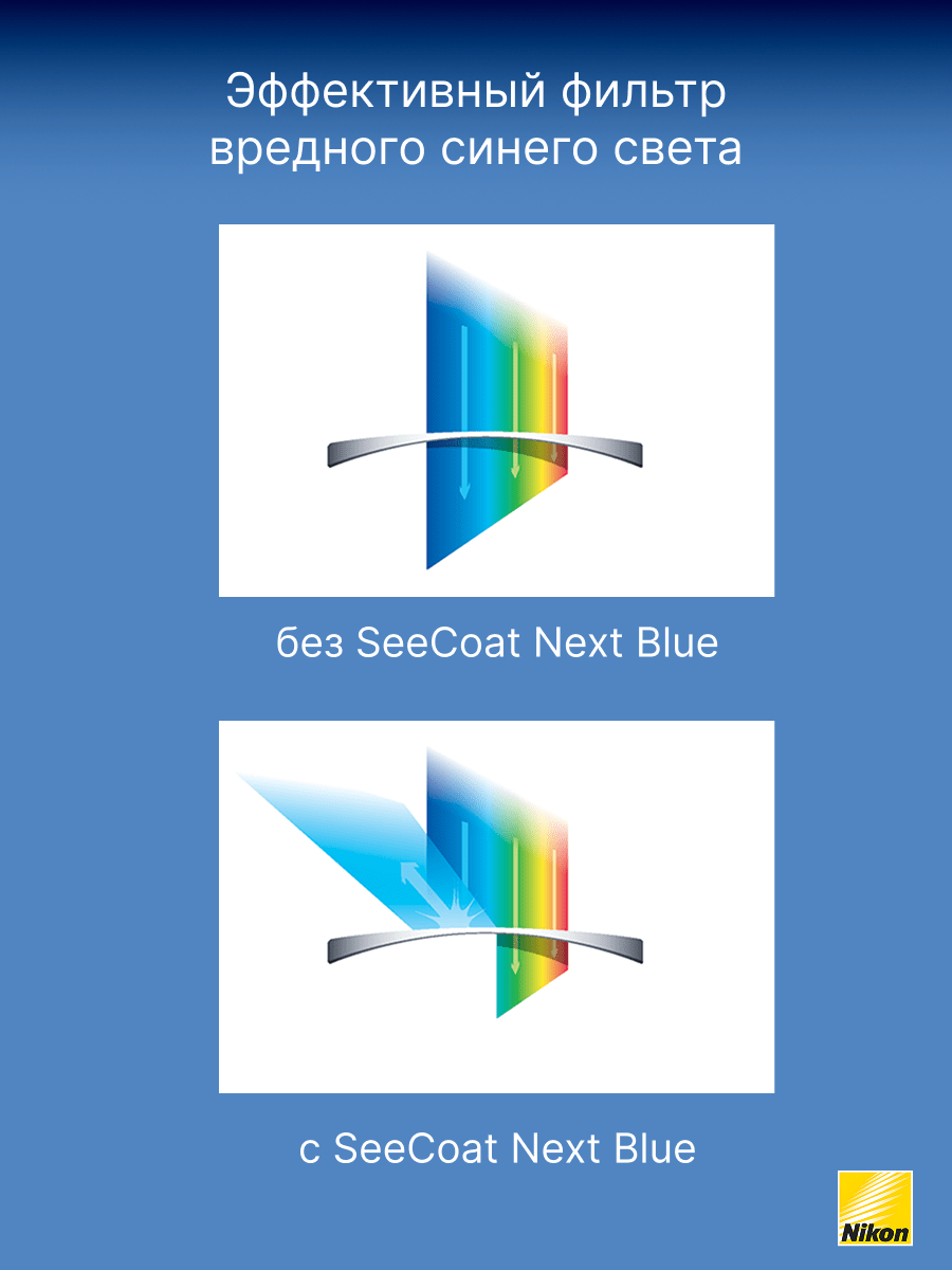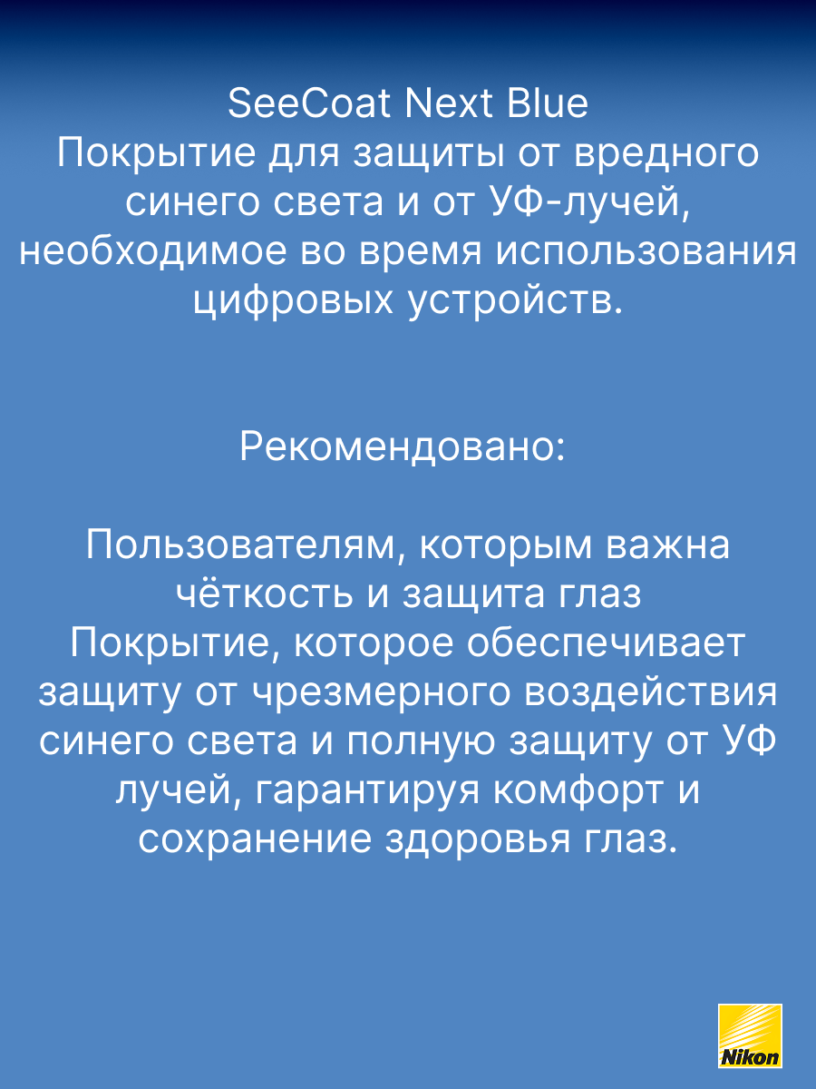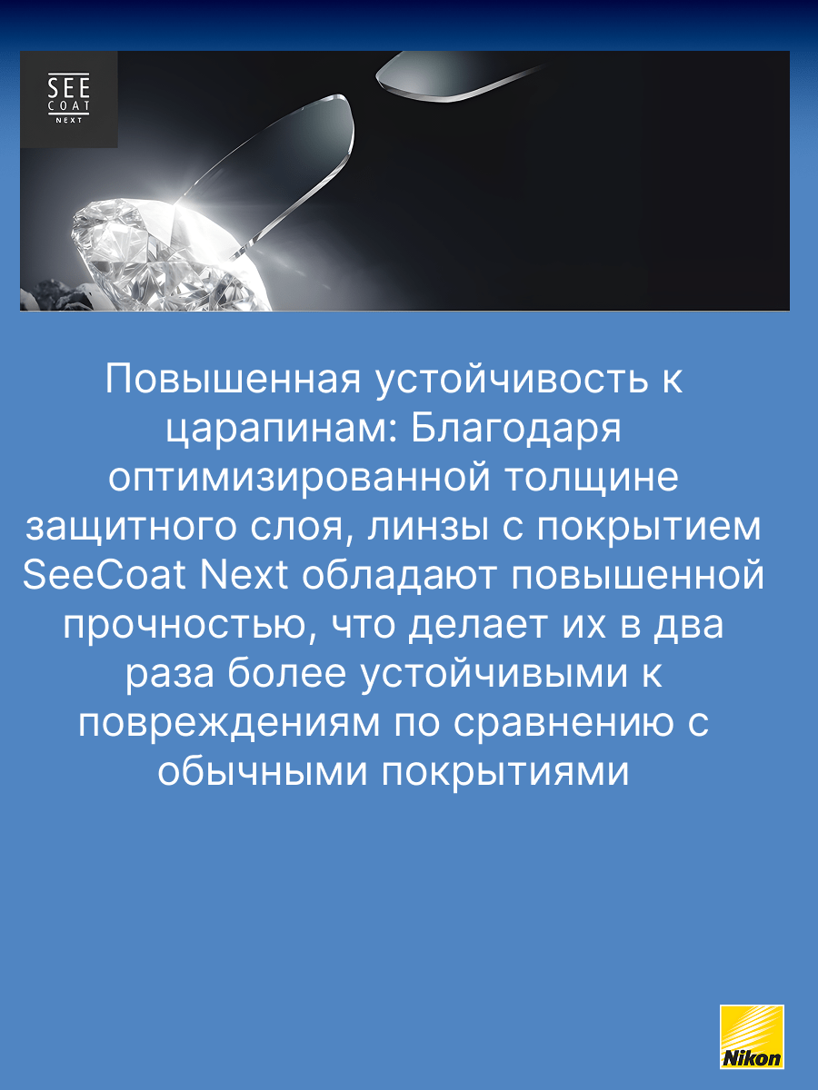 SeeCoat Next — это инновационное многофункциональное покрытие для очковых линз от компании Nikon. Оно обеспечивает максимально высокий уровень прозрачности и комфорта в любых условиях. Благодаря передовым технологиям, покрытие эффективно защищает линзы от царапин, отпечатков пальцев, пыли и пятен, облегчая уход за очками в течение всего срока службы. Устойчивость к царапинам — особый прочный слой надёжно защищает линзы от механических повреждений. Антистатический эффект — снижает накопление пыли и иных загрязнений на поверхности линзы. Защита от пятен и отпечатков — гидрофобное и олеофобное покрытие предотвращает появление следов от пальцев и облегчает очистку. Высокая прозрачность — минимальное отражение и максимальная чёткость зрения даже при ярком свете. Долговечность — покрытие сохраняет свои свойства даже при длительном и интенсивном использовании. SeeCoat Next от Nikon — это выбор для тех, кто ценит идеальную чистоту, высокой качество зрения и долговечность линз своих очков.