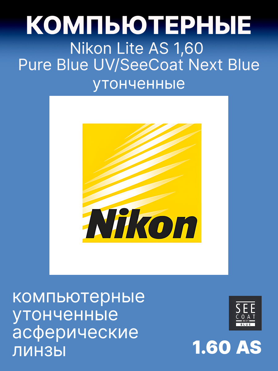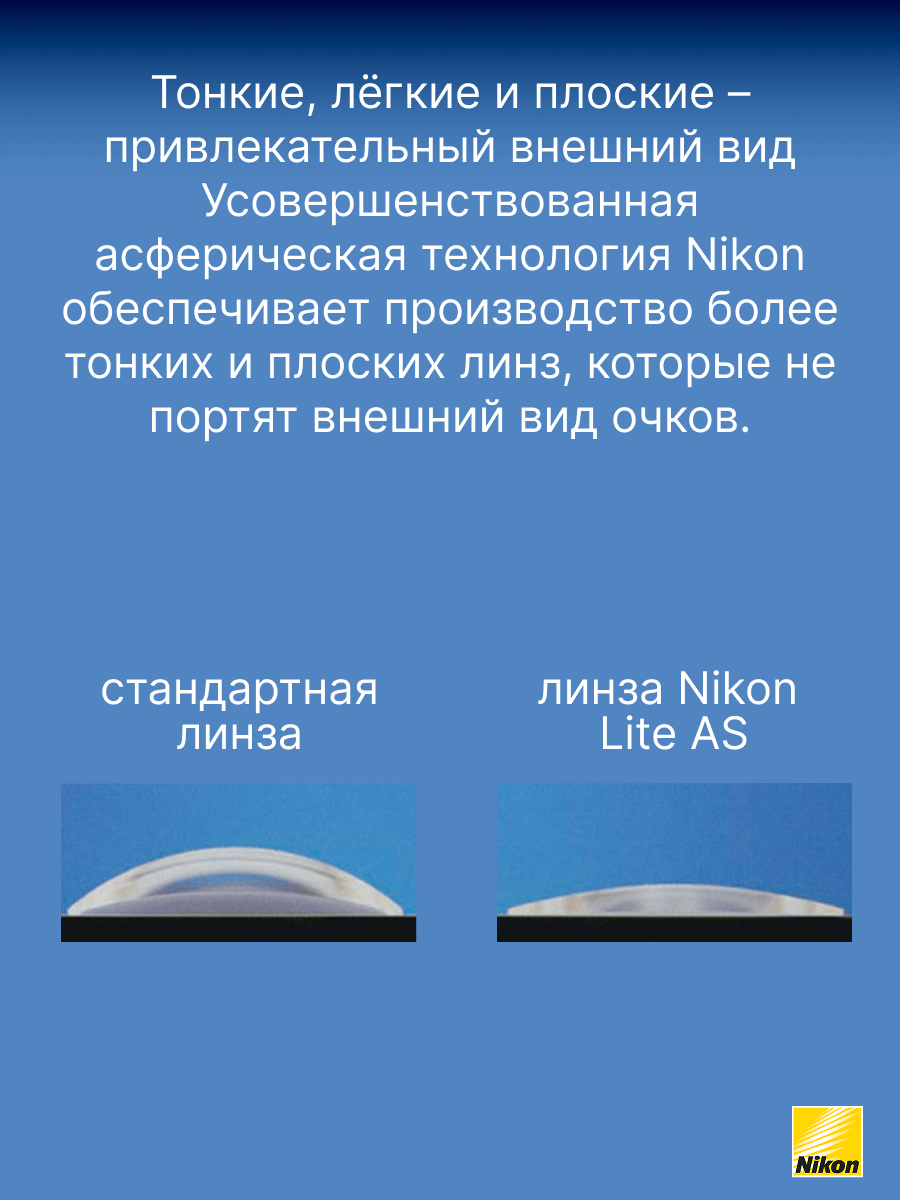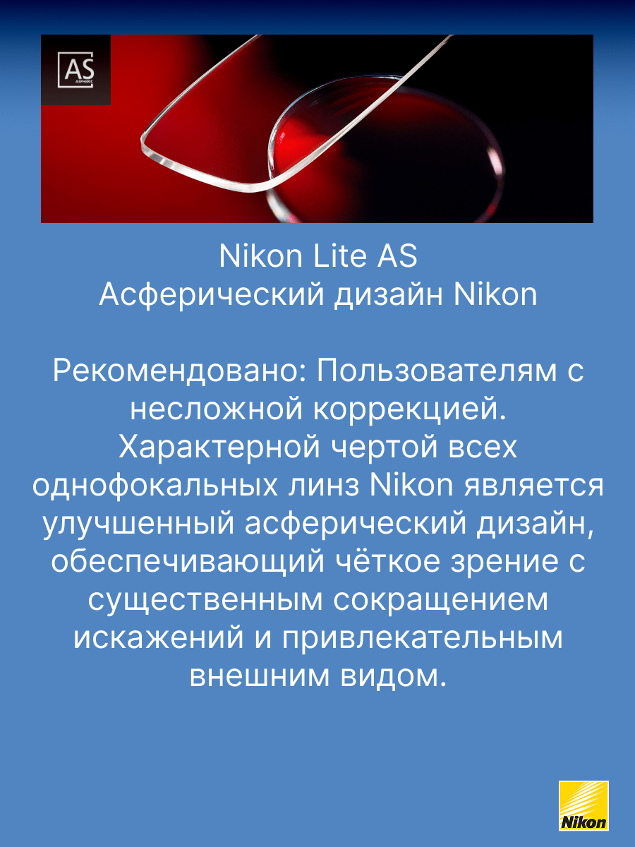 Тонкие однофокальные линзы асферического дизайна Nikon Lite AS 1,60 с покрытием Pure Blue UV обеспечивают четкое зрение и обладают потрясающим внешним видом. До 30% тоньше и до 30% легче, чем обычные линзы из материала 1.50. До 30% более плоские, чем линзы стандартного дизайна из материала 1.50. Благодаря технологии асферизации Вы в меньшей степени ощущаете изменение размеров окружающих предметов, а размер глаз выглядит более естественно. Многофункциональное покрытие Pure Blue UV гарантирует бескомпромиссный зрительный комфорт, простоту ухода и долгий срок службы линз. Обеспечивает 100% защиту от УФ излучения (400 нм.)