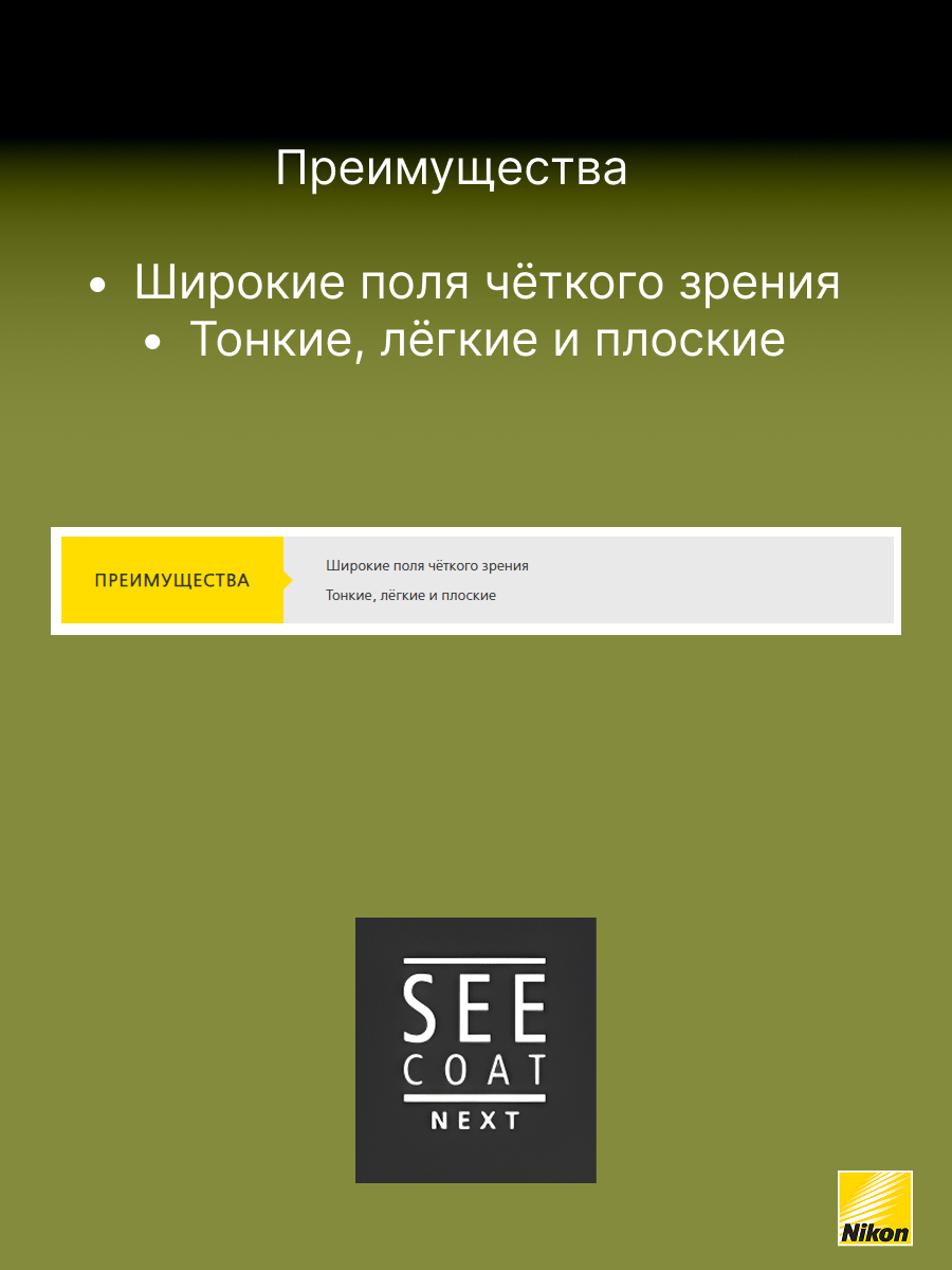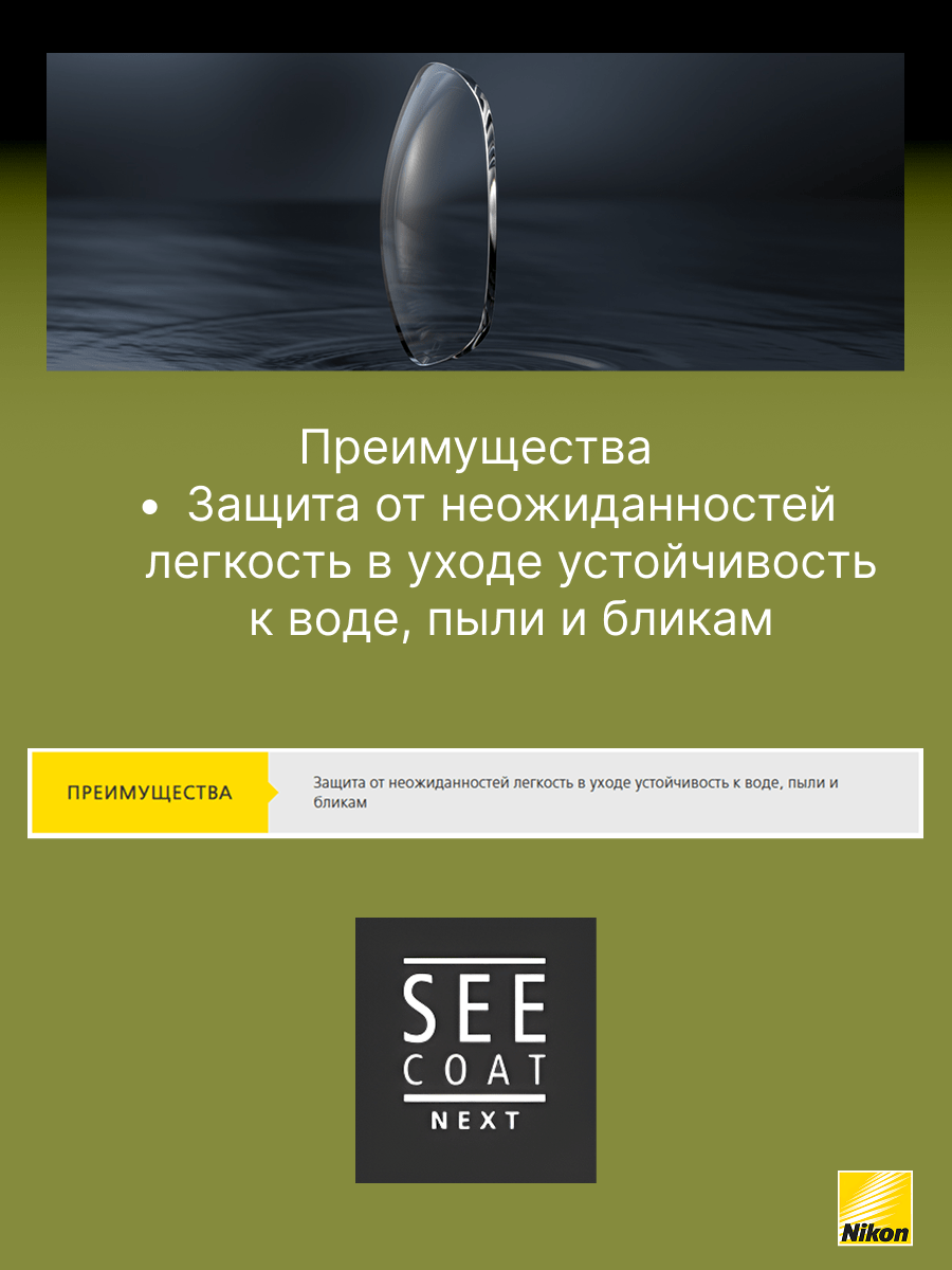 SeeCoat Next — это инновационное многофункциональное покрытие для очковых линз от компании Nikon. Оно обеспечивает максимально высокий уровень прозрачности и комфорта в любых условиях. Благодаря передовым технологиям, покрытие эффективно защищает линзы от царапин, отпечатков пальцев, пыли и пятен, облегчая уход за очками в течение всего срока службы. Устойчивость к царапинам — особый прочный слой надёжно защищает линзы от механических повреждений. Антистатический эффект — снижает накопление пыли и иных загрязнений на поверхности линзы. Защита от пятен и отпечатков — гидрофобное и олеофобное покрытие предотвращает появление следов от пальцев и облегчает очистку. Высокая прозрачность — минимальное отражение и максимальная чёткость зрения даже при ярком свете. Долговечность — покрытие сохраняет свои свойства даже при длительном и интенсивном использовании. SeeCoat Next от Nikon — это выбор для тех, кто ценит идеальную чистоту, высокой качество зрения и долговечность линз своих очков.