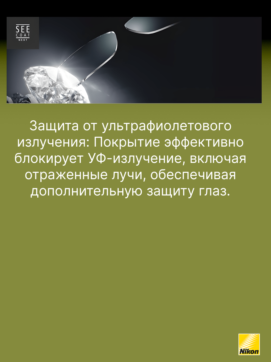 Совершенное многофункциональное покрытие SeeCoat Plus UV от компании Nikon. При создании покрытия Seecoat+ UV были использованы самые передовые технологии производства, что позволило произвести реконструкцию и оптимизацию слоев покрытия. В конечном результате пользователю линз гарантируется высокий уровень качества и комфорта, а также превосходные оптические характеристики покрытия. Основные преимущства: полная защита от УФ лучей (как от прямых, так и от отраженных) эстетичный внешний вид (технология BROADBAND) отличные антистатические свойства обеспечивают простоту ухода (технология STATIC DIFFUSION) толщина просветляющего покрытия оптимизирована для лучшей устойчивости к появлению царапин (технология POWER GUARD) *состав упрочняющего и базового слоев покрытия усовершенствован для гарантированной защиты от механических повреждений для увеличения устойчивости к механическим повреждениям (технология NANO FLEX)