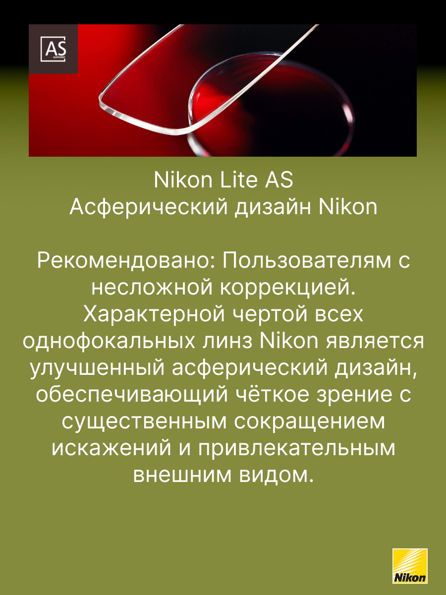 Супертонкие однофокальные линзы асферического дизайна Nikon Lite AS 1,74 с покрытием Seecoat Plus UV обеспечивают четкое зрение и обладают потрясающим внешним видом. До 50% тоньше и легче, чем обычные линзы из материала 1.50. Благодаря технологии асферизации Вы в меньшей степени ощущаете изменение размеров окружающих предметов, а размер глаз выглядит более естественно. Многофункциональное покрытие SeeСoat Plus UV гарантирует бескомпромиссный зрительный комфорт, простоту ухода и долгий срок службы линз. Обеспечивает 100% защиту от УФ излучения (400 нм.) Срок поставки линз до Москвы 10 рабочих дней.